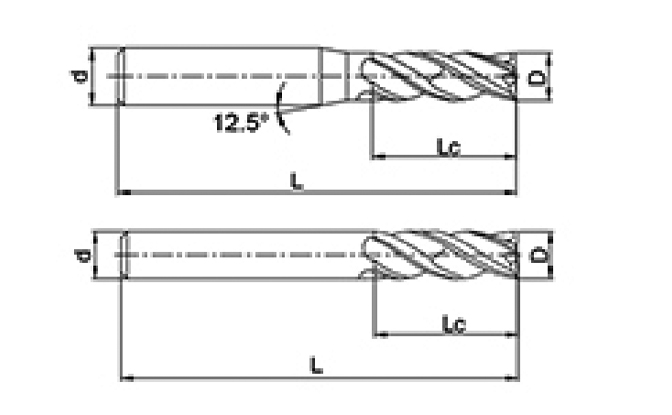 | Nee. | Diameter D | Fluit lengte Lc | Totale lengte L | Schacht Dia d | Aantal messen F |