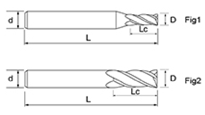 | Nee. | Diameter D | Fluit lengte Lc | Totale lengte L | Schacht Dia d | Aantal messen F |