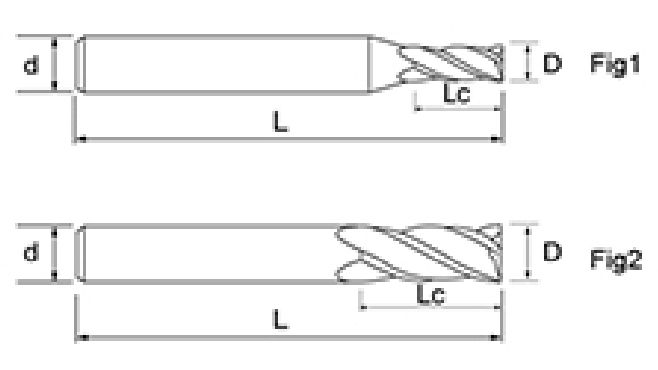 | Nee. | Diameter D | Fluit lengte Lc | Totale lengte L | Schacht Dia d | Aantal messen F |