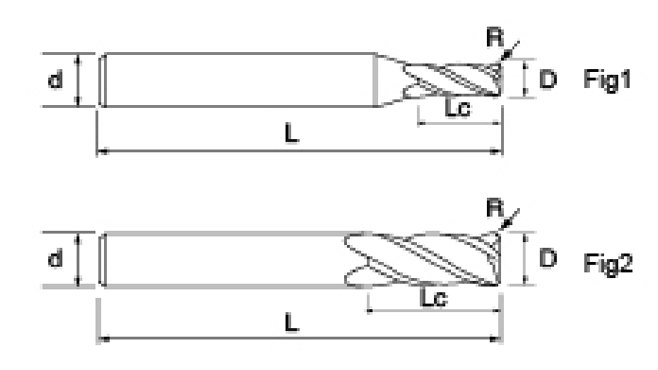 | Gereedschap serie | Diameter | Straal | Hoekradius | Fluit lengte | Effectieve lengte | Totale lengte | Schacht Dia | |||