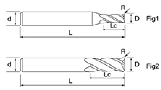 | Gereedschap serie | Diameter | Straal | Hoekradius | Fluit lengte | Effectieve lengte | Totale lengte | Schacht Dia | |||
