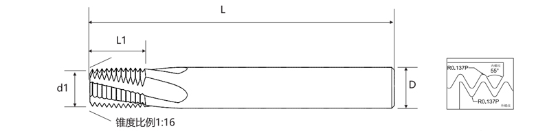 Deze frees is geschikt voor een verscheidenheid aan materialen, waaronder koolstofstaal, gelegeerd staal, roestvrij staal, gietijzer, non-ferrometalen en kunststoffen. Het is verkrijgbaar in meerdere specificaties, variërend van RC1/16 tot 2", en biedt flexibiliteit om tegemoet te komen aan uiteenlopende toepassingsbehoeften. Het ontwerp van het gereedschap maakt aanpasbare parameterconfiguraties mogelijk, waaronder snijdiameter d1, effectieve snijlengte L1, schachtdiameter D en totale lengte L, waardoor de bewerkingsefficiëntie en draadkwaliteit worden geoptimaliseerd.
